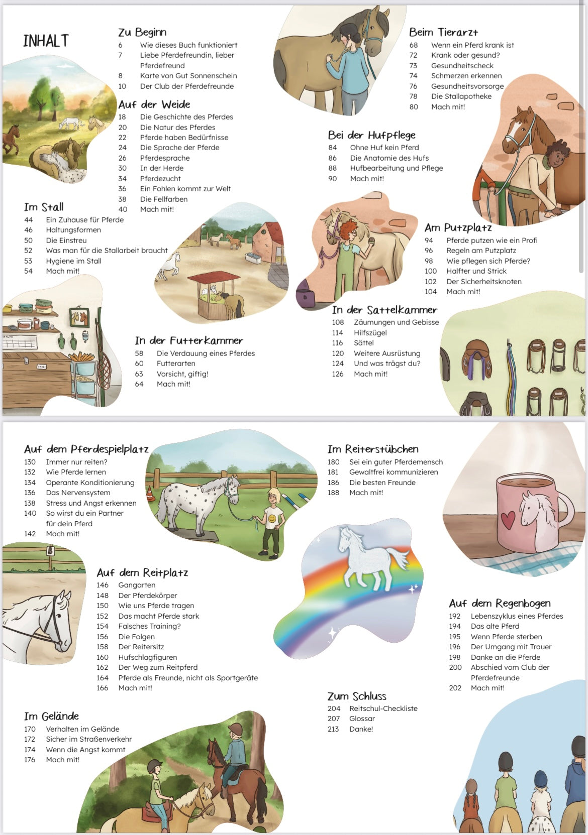 Verbringe einen Tag auf Gut Sonnenschein mit dem Club der Pferdefreunde! In diesem bunten Sachbuch lernst du, wie Pferde leben möchten, was sie brauchen und wie wir mit ihnen umgehen können, um ihnen echte Freunde zu sein. In 12 Kapiteln erkundest du Gut Sonnenschein und erfährst jede Menge Spannendes: Wie wollen Pferde wohnen? Was fressen sie? Wie lernen Pferde? Warum können sie uns eigentlich tragen? Welche Sprache sprechen Pferde – und wie können wir mit ihnen kommunizieren? … und noch viel mehr wertvolles Pferdewissen! Dich erwarten tolle Mitmachseiten zum Basteln, Rätseln und Entdecken – inklusive passendem Material zum Download! Ein Buch für alle, die Pferde lieben und lernen wollen, wie wir ihnen gute Freunde sein können.