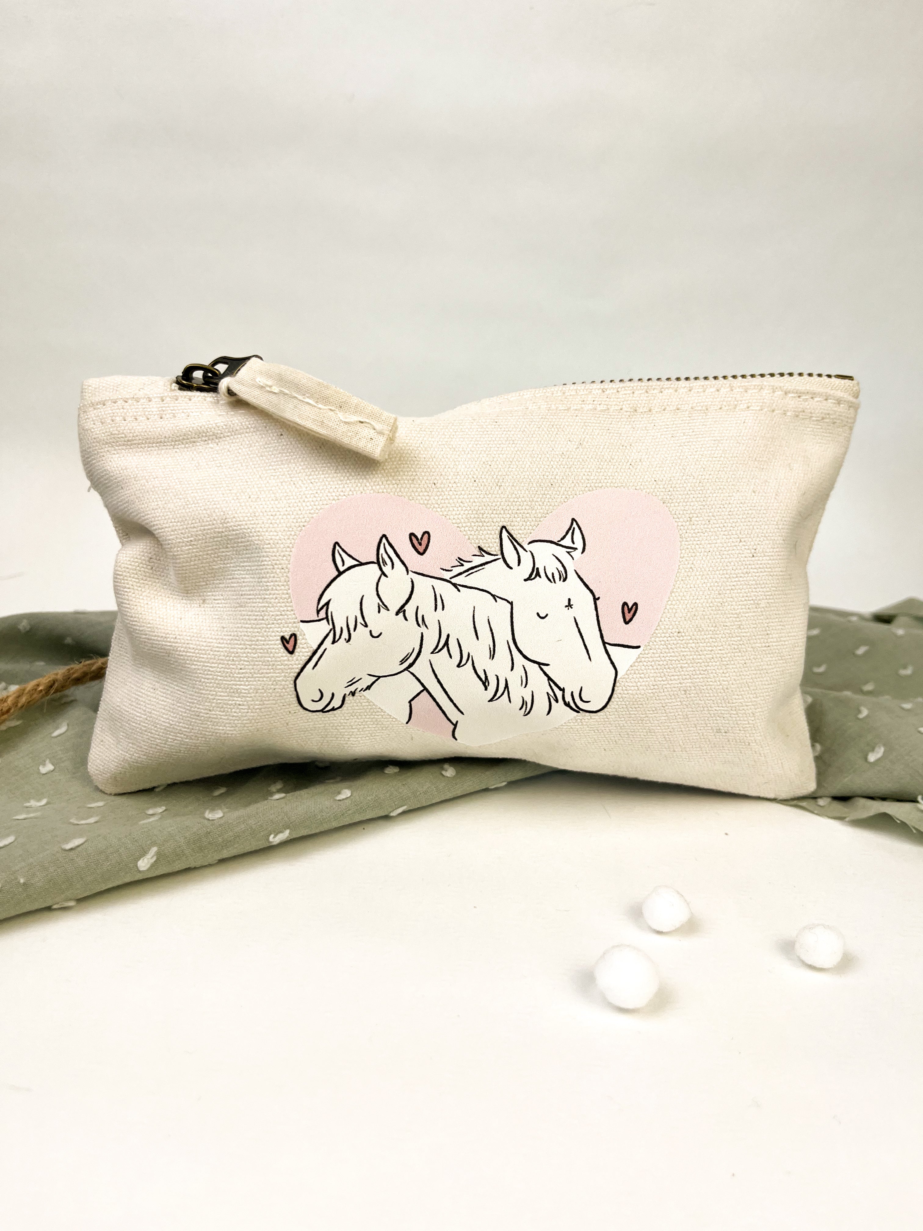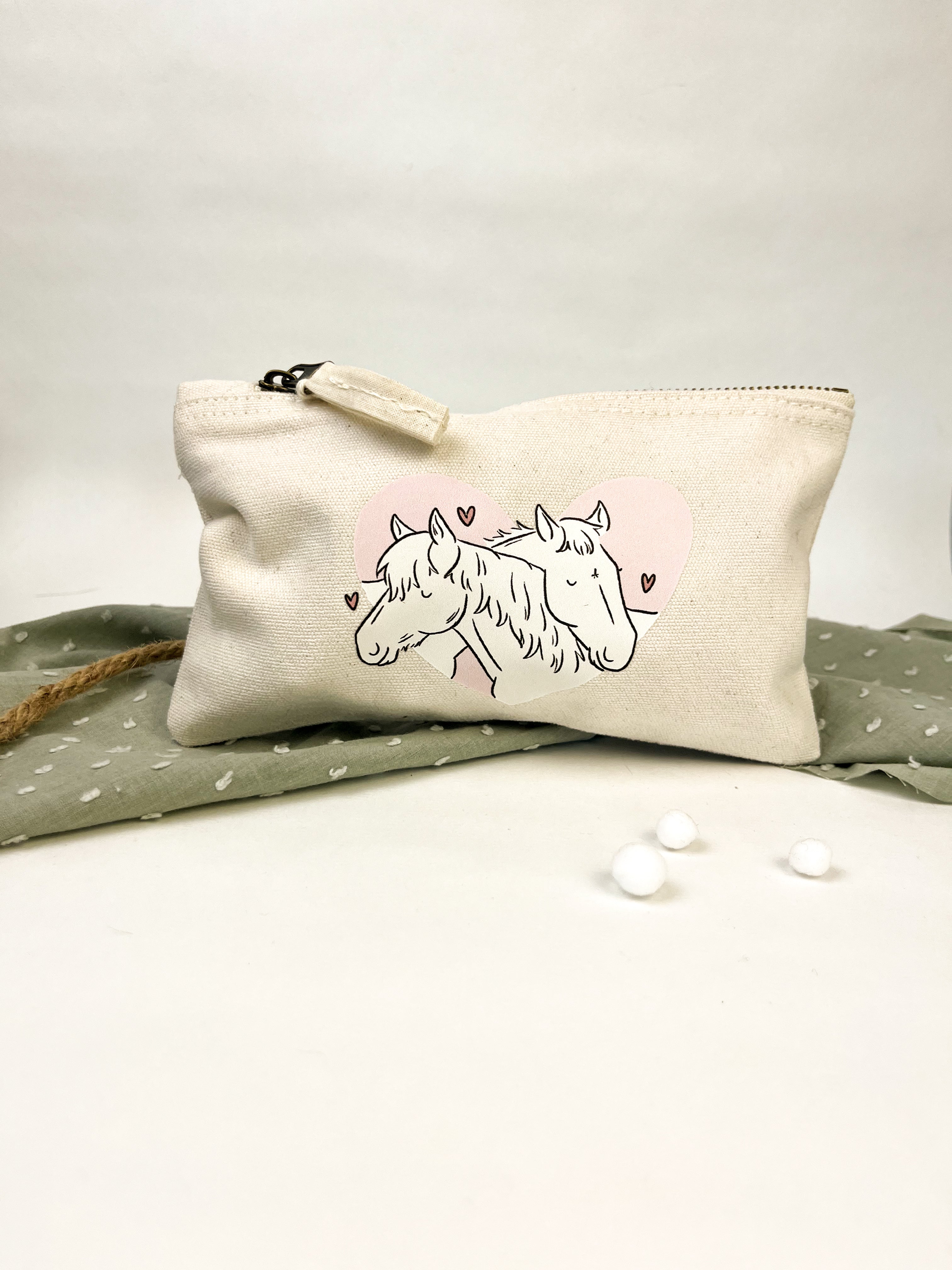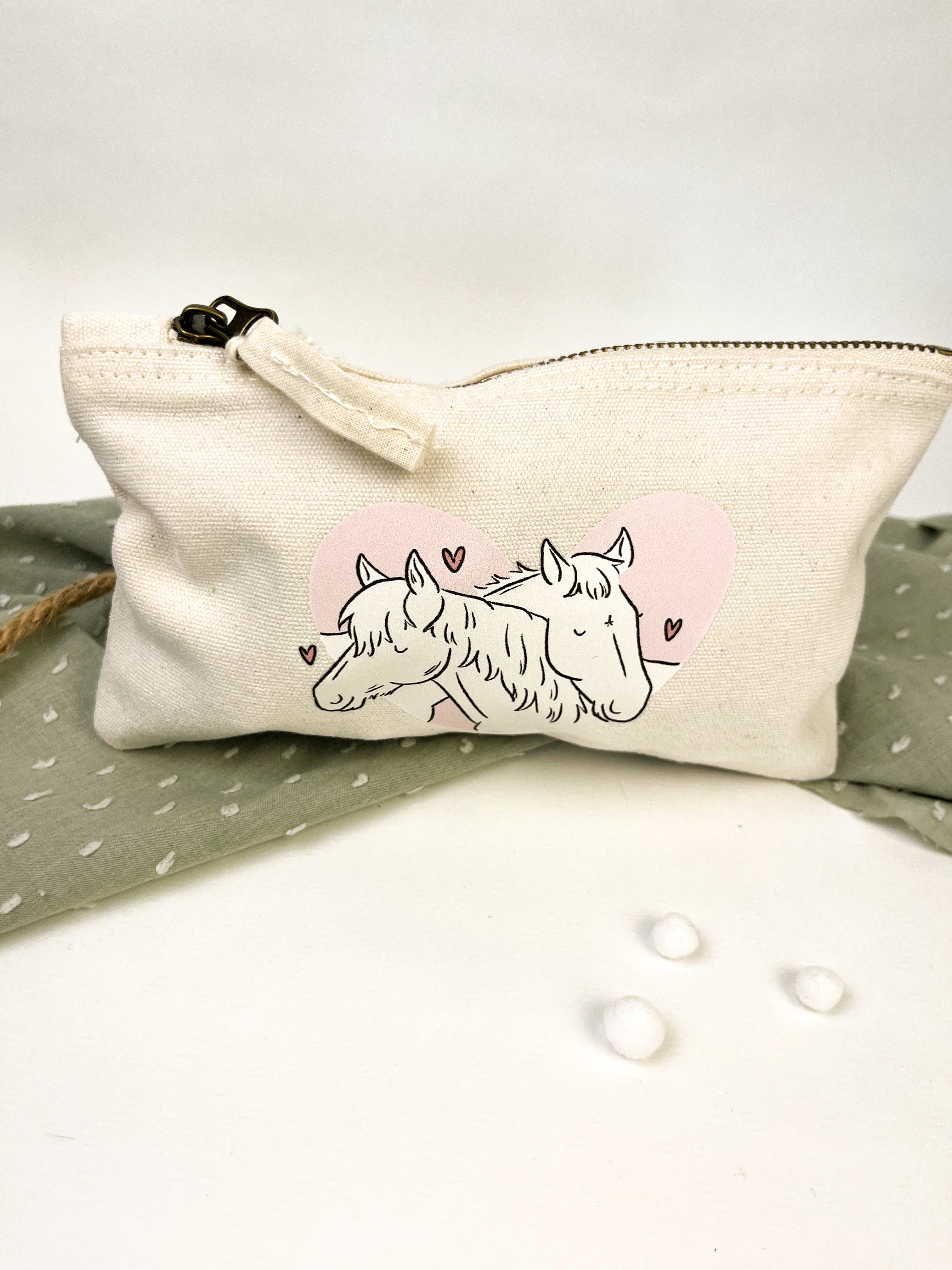 Dieser Kulturbeutel begleitet dich zuverlässig auf Reisen, im Alltag oder am Stall. Er bietet genug Platz für Kosmetik, Pflegeprodukte oder Stifte und wird durch meine liebevoll gestalteten Illustrationen zu einem ganz besonderen Begleiter.