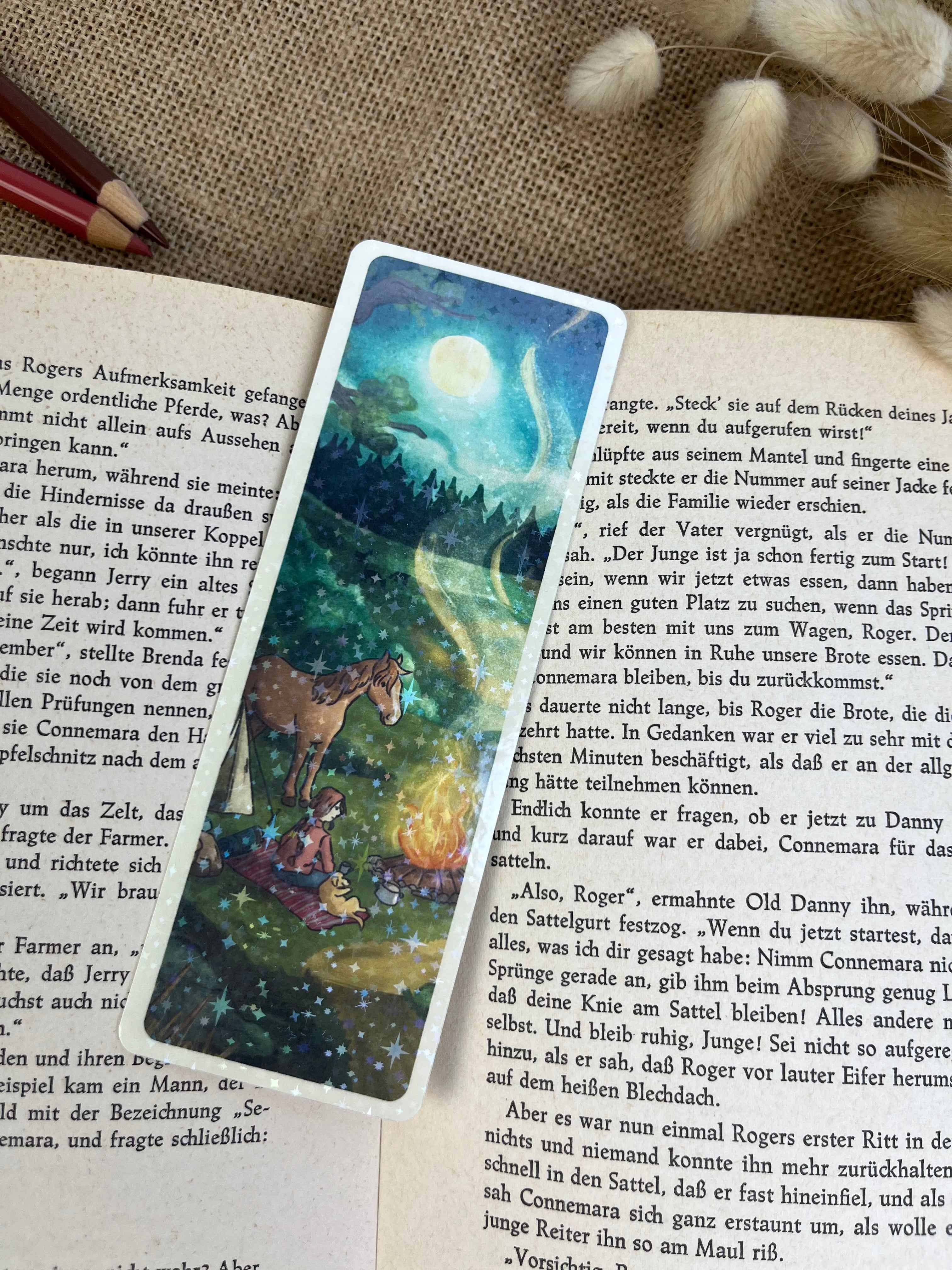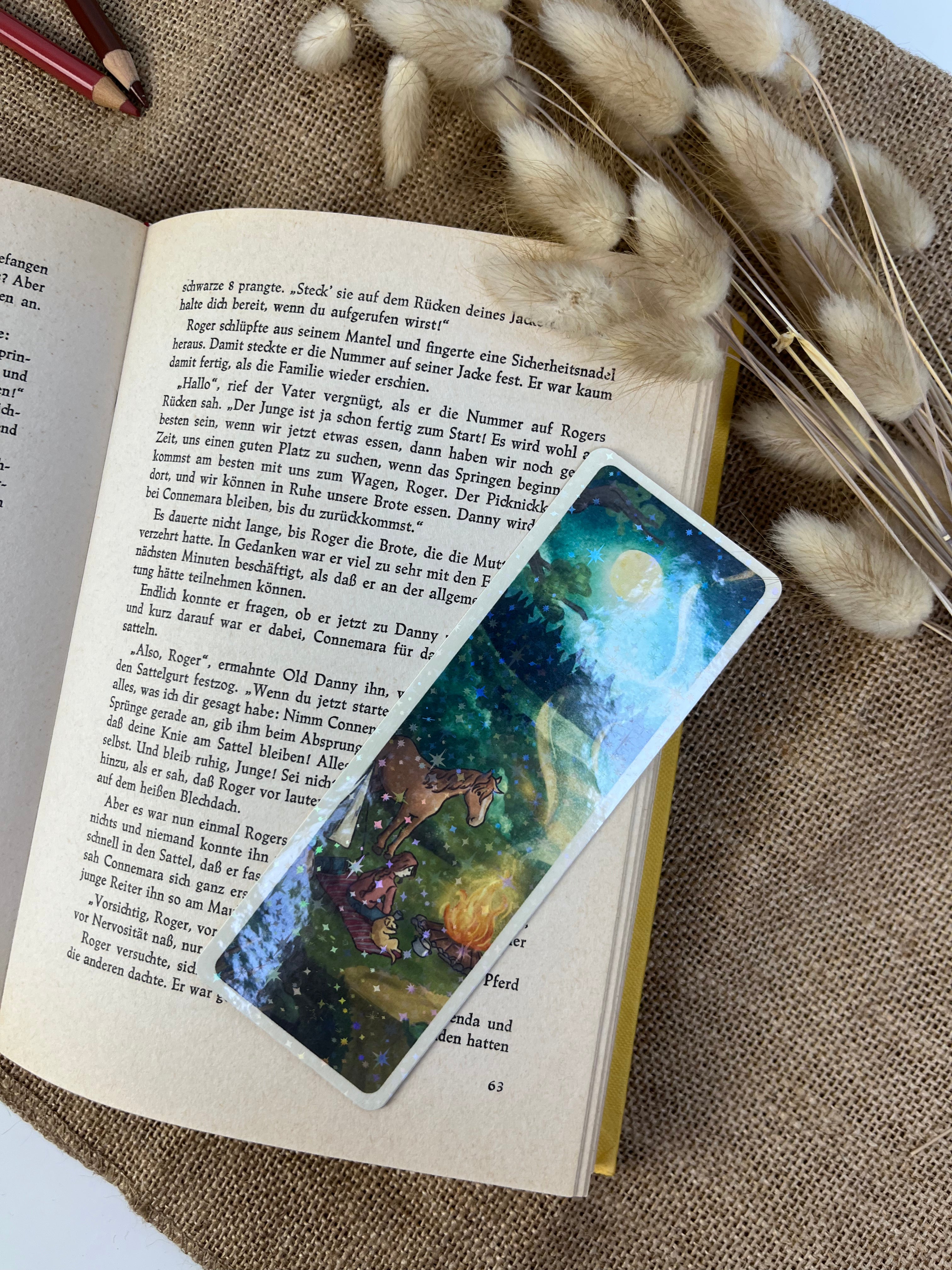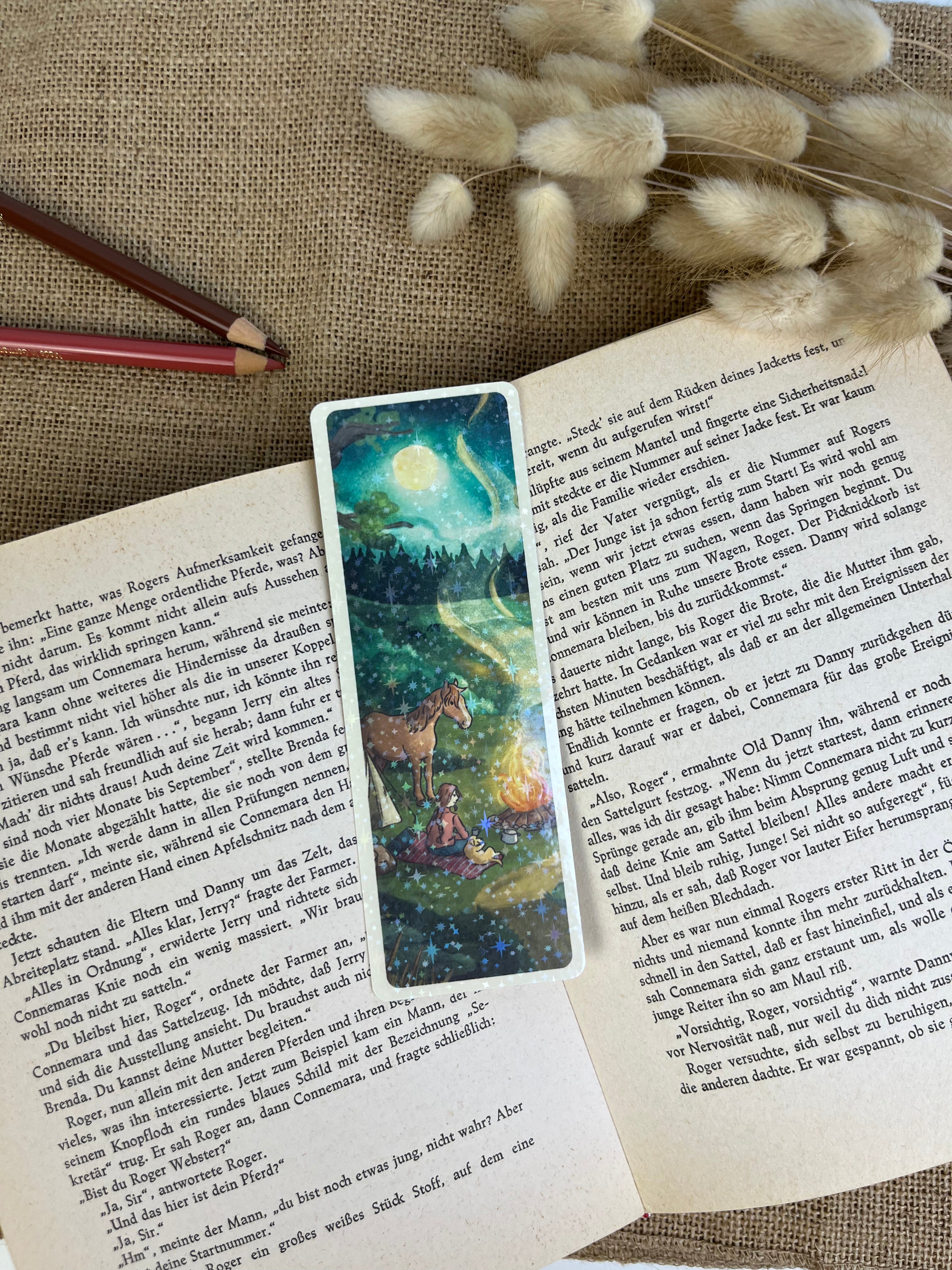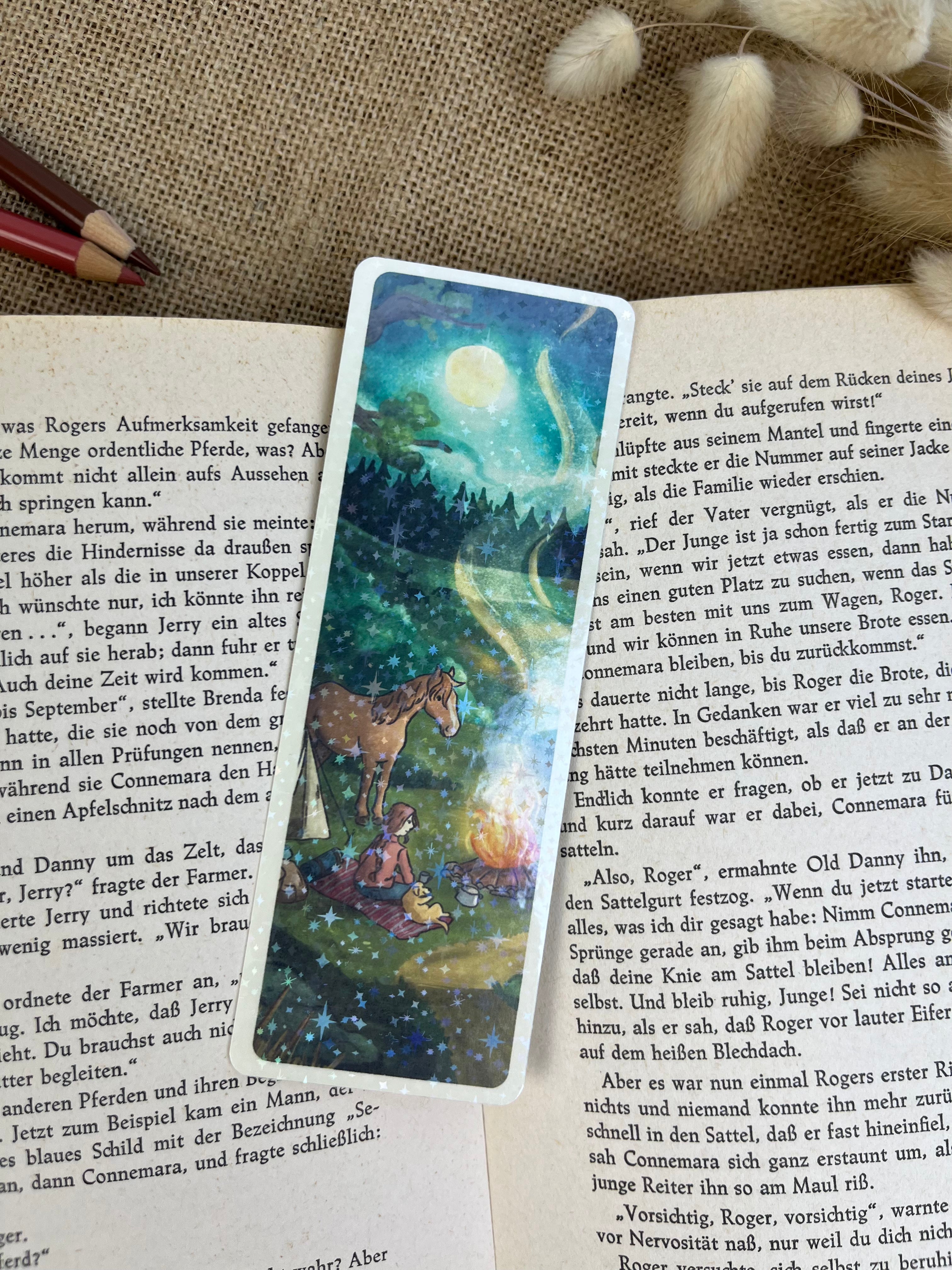 Mit diesem Lesezeichen wird jede Lesestunde ein kleines bisschen schöner. Die Illustration auf der Vorderseite wird von mir mit einer feinen Glitzer-Sternenfolie veredelt, die das Licht dezent einfängt und dem Motiv einen besonderen Akzent verleiht.