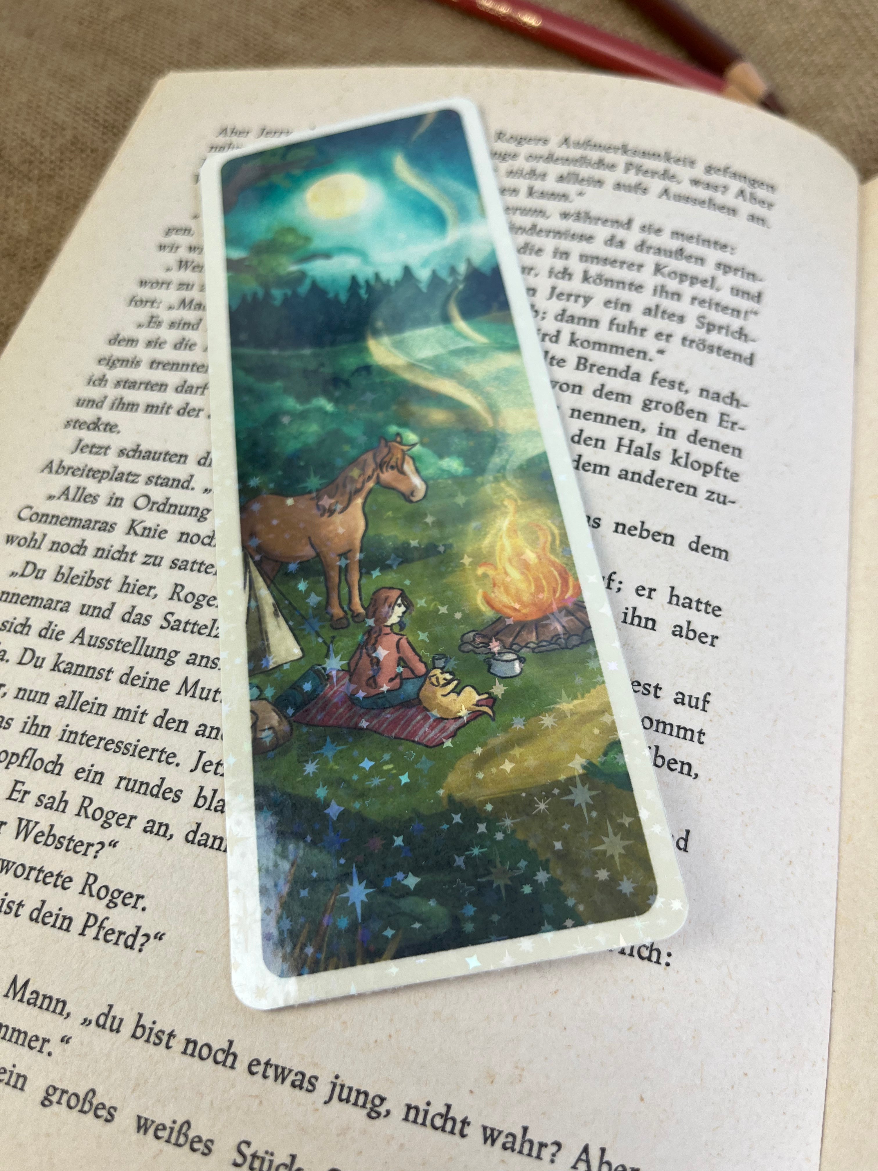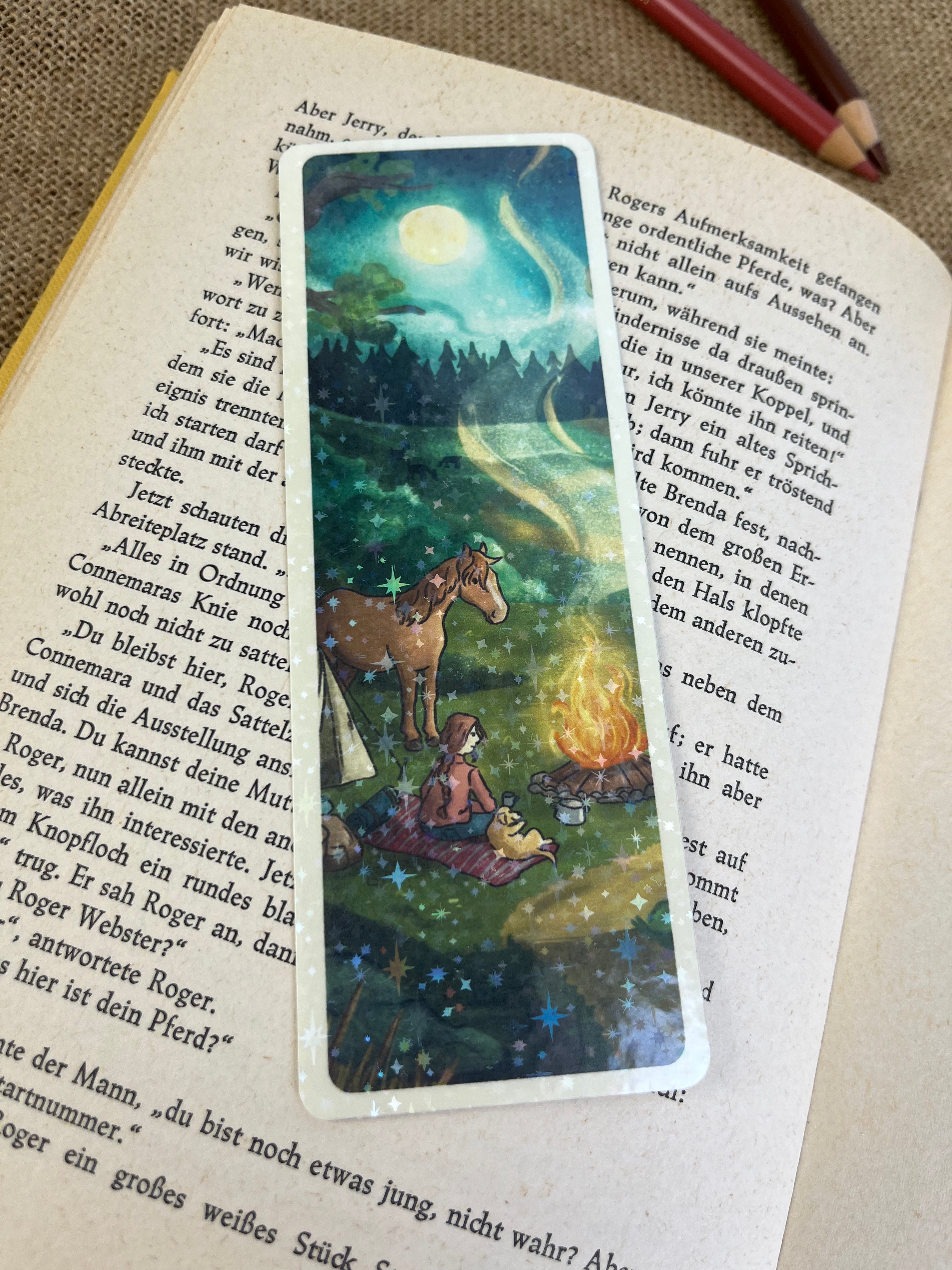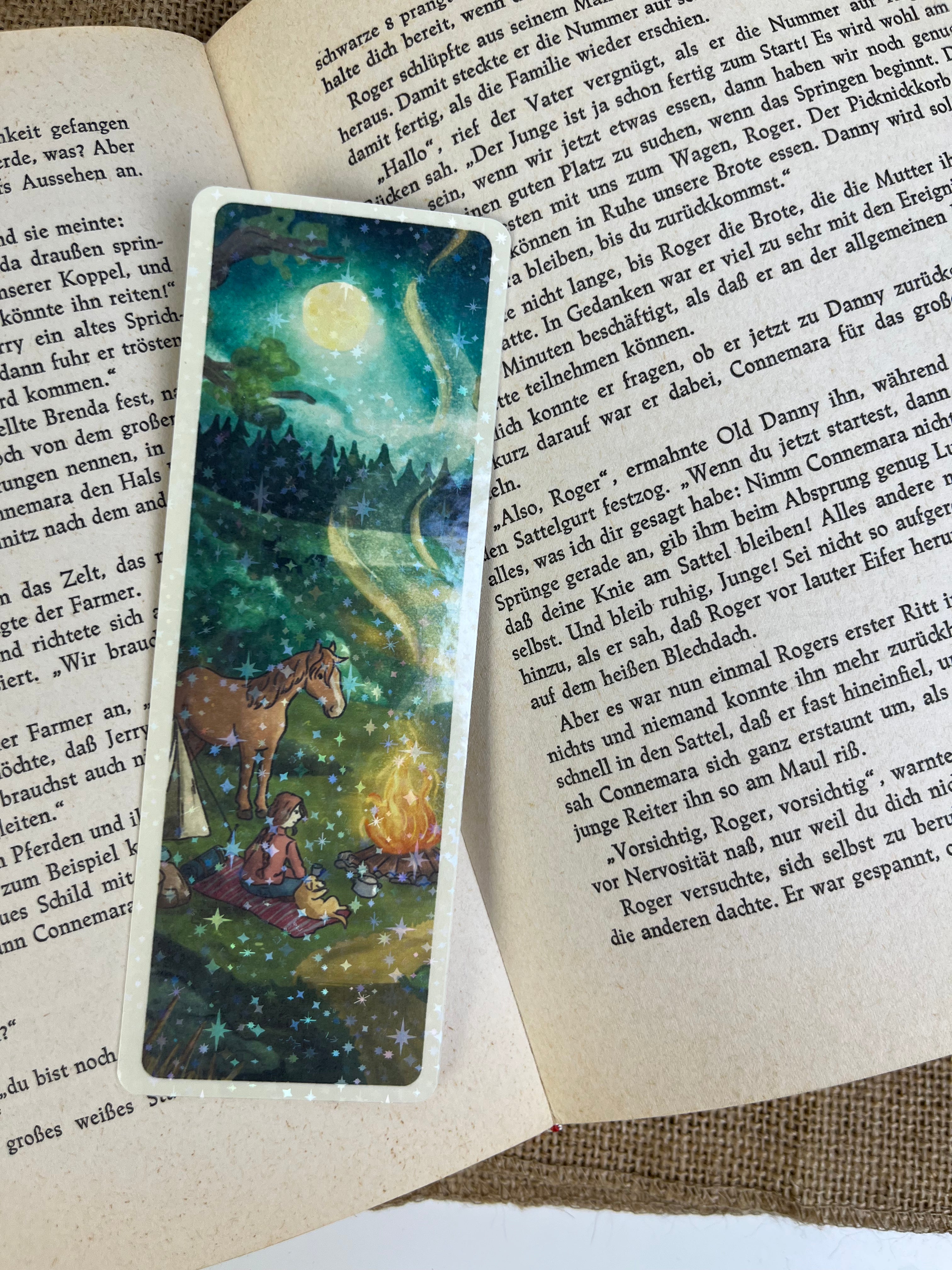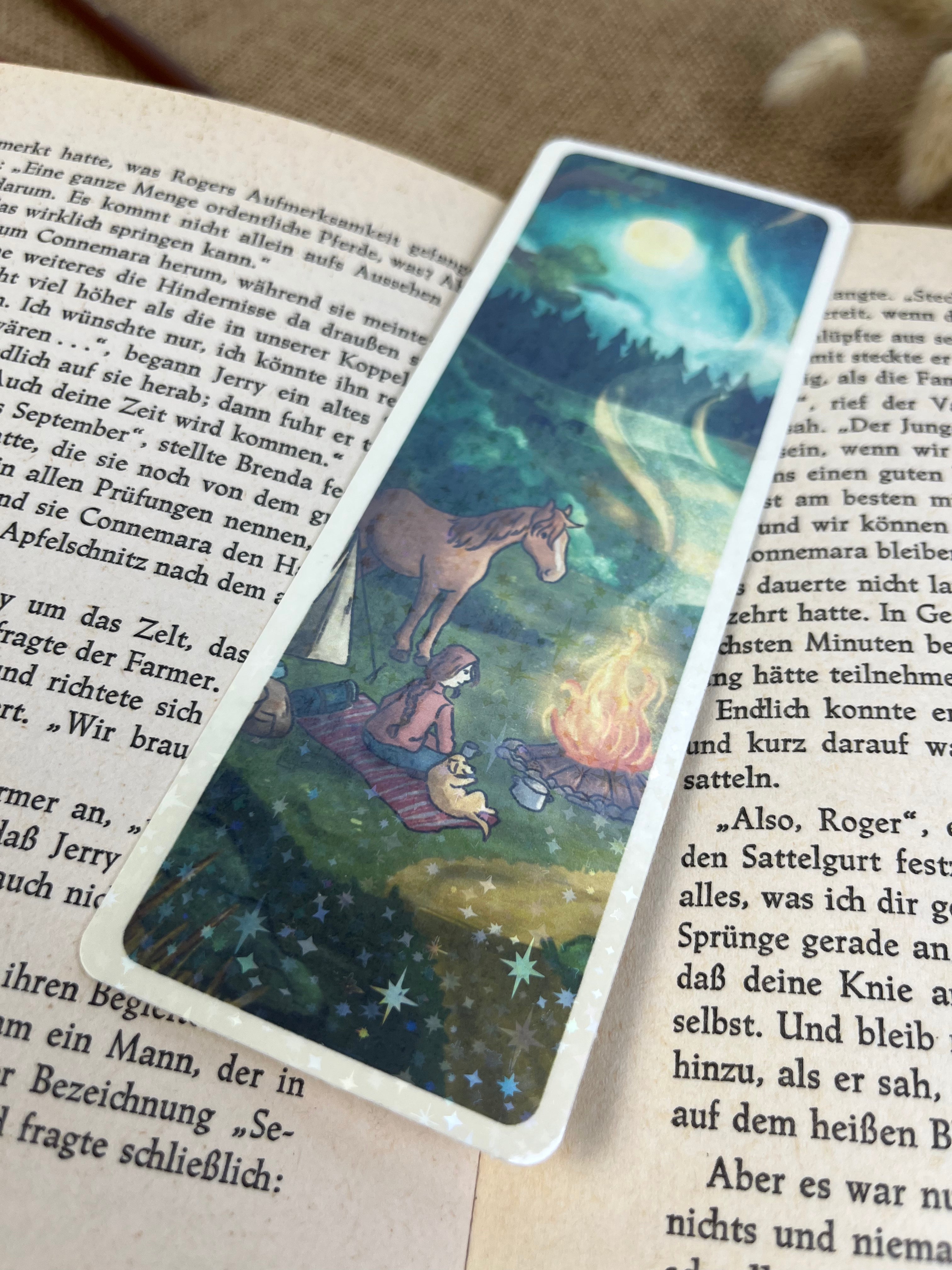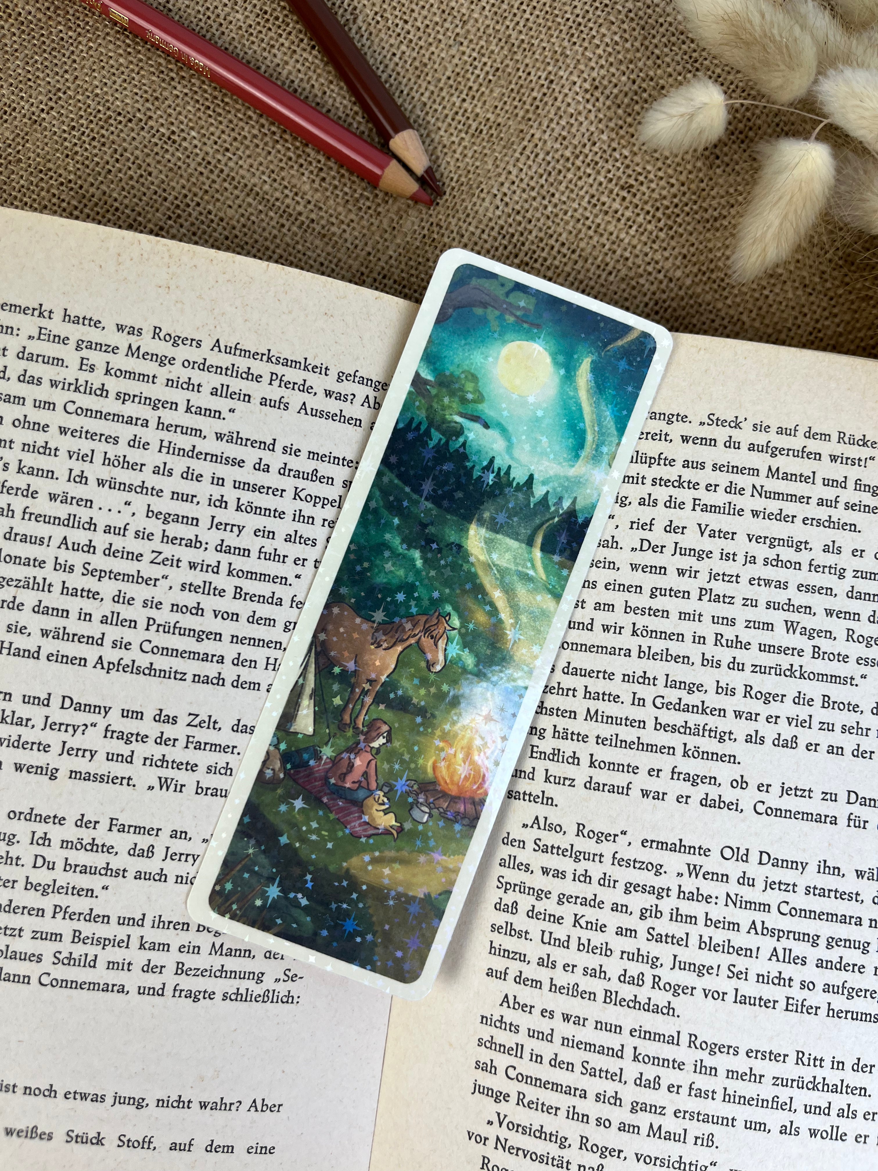 Mit diesem Lesezeichen wird jede Lesestunde ein kleines bisschen schöner. Die Illustration auf der Vorderseite wird von mir mit einer feinen Glitzer-Sternenfolie veredelt, die das Licht dezent einfängt und dem Motiv einen besonderen Akzent verleiht.