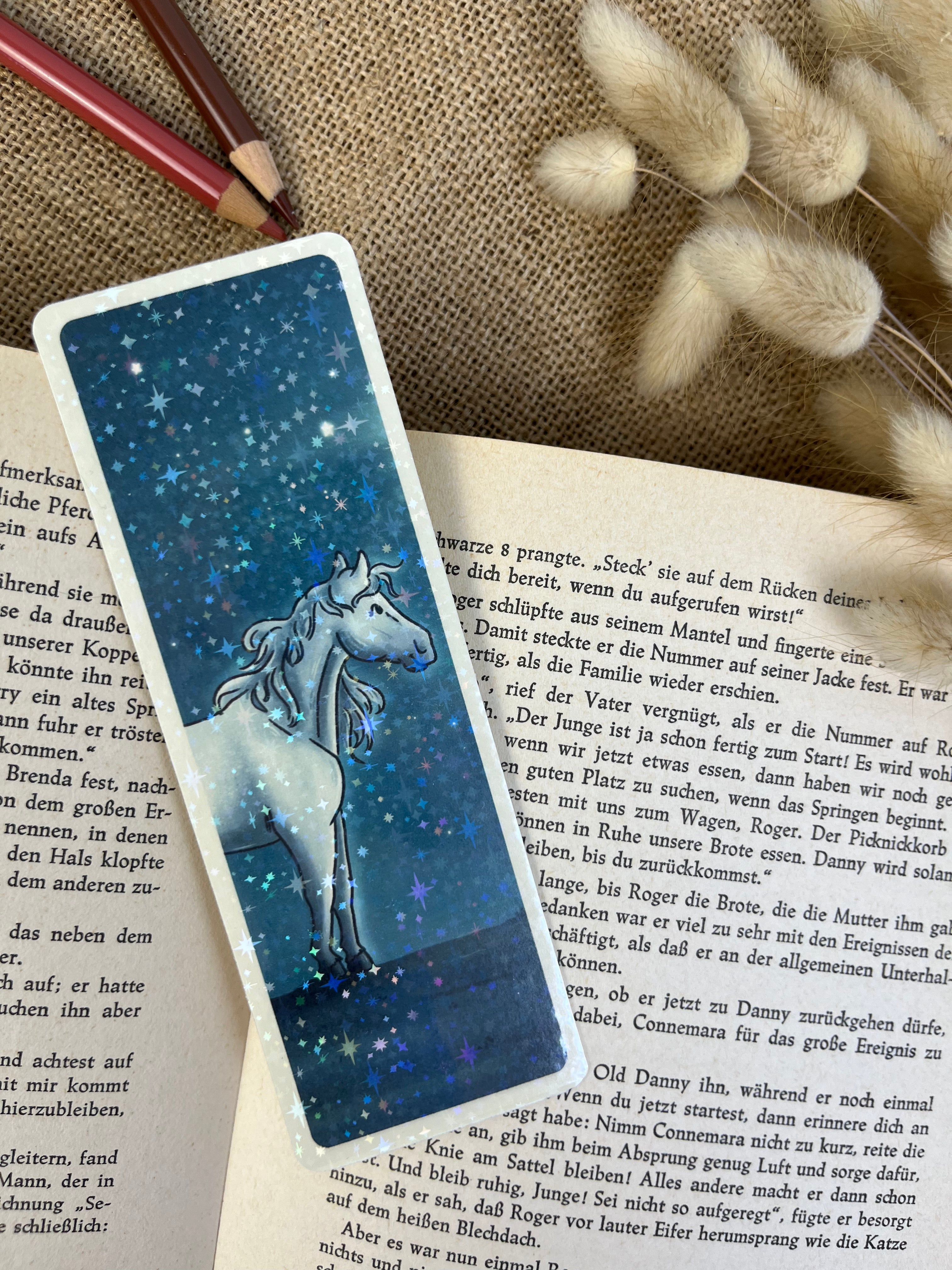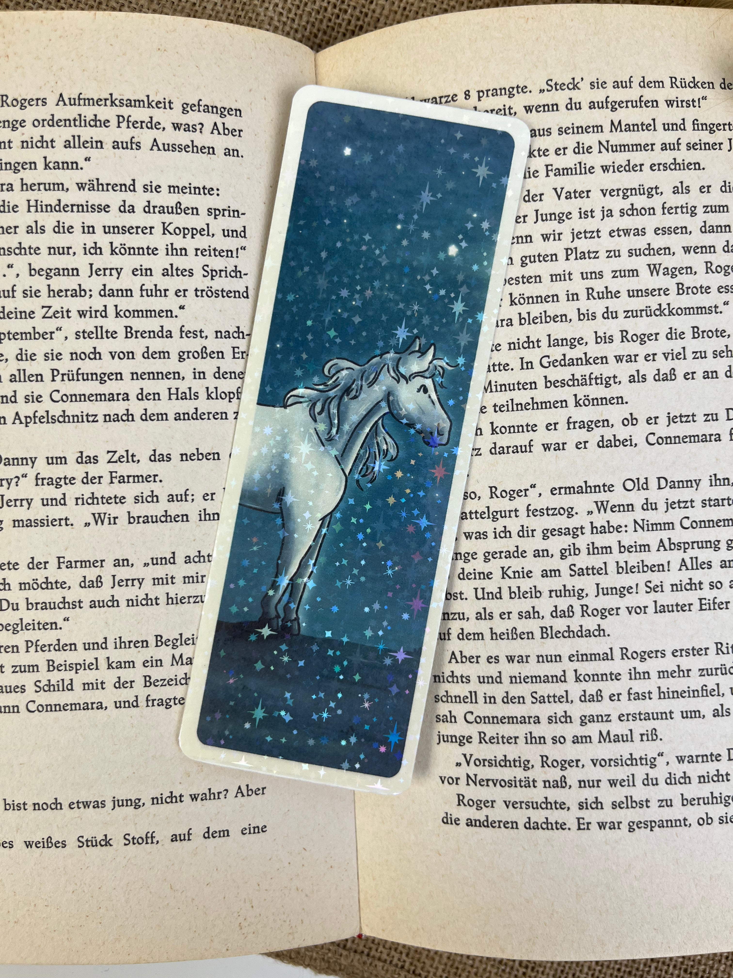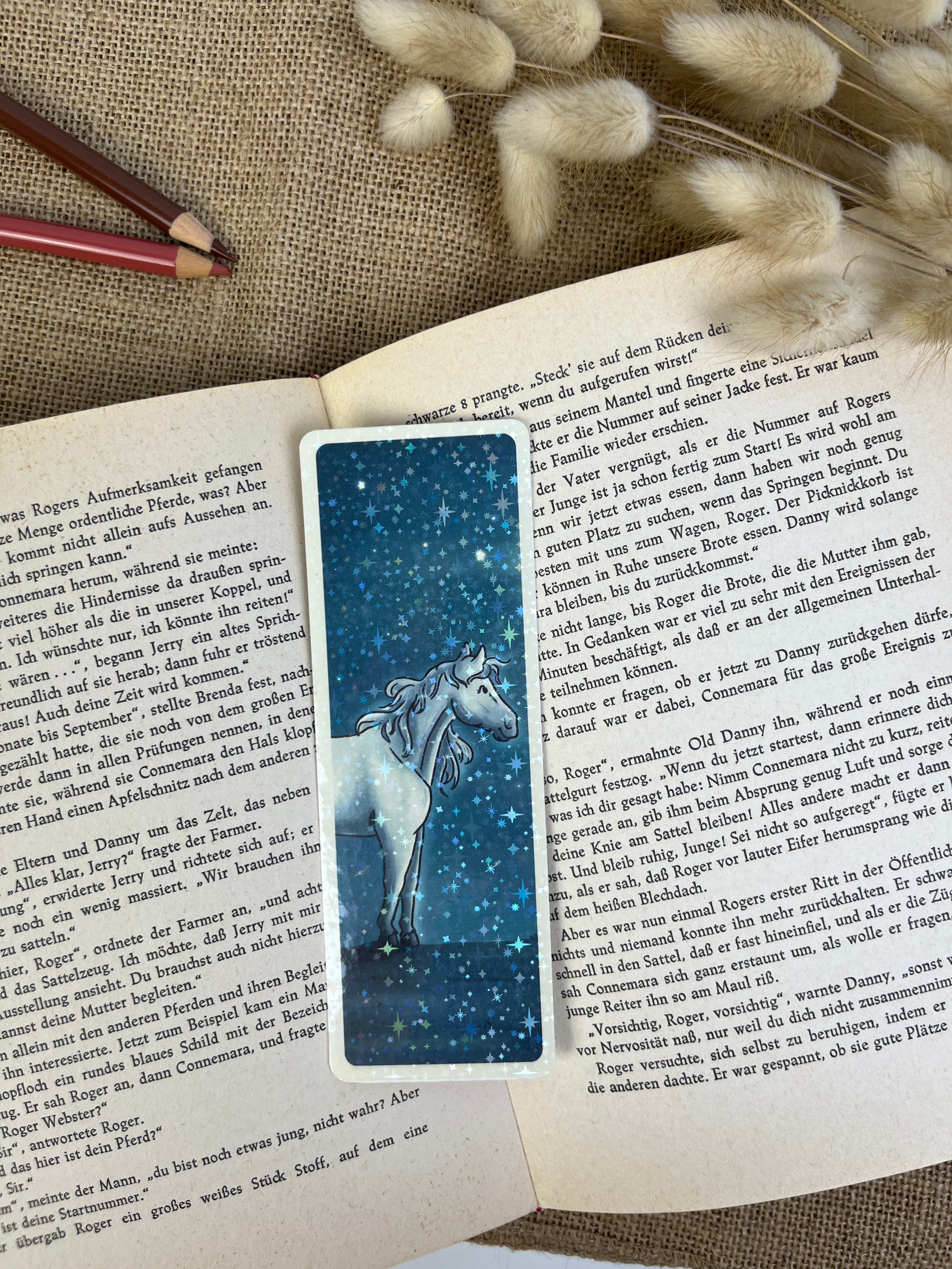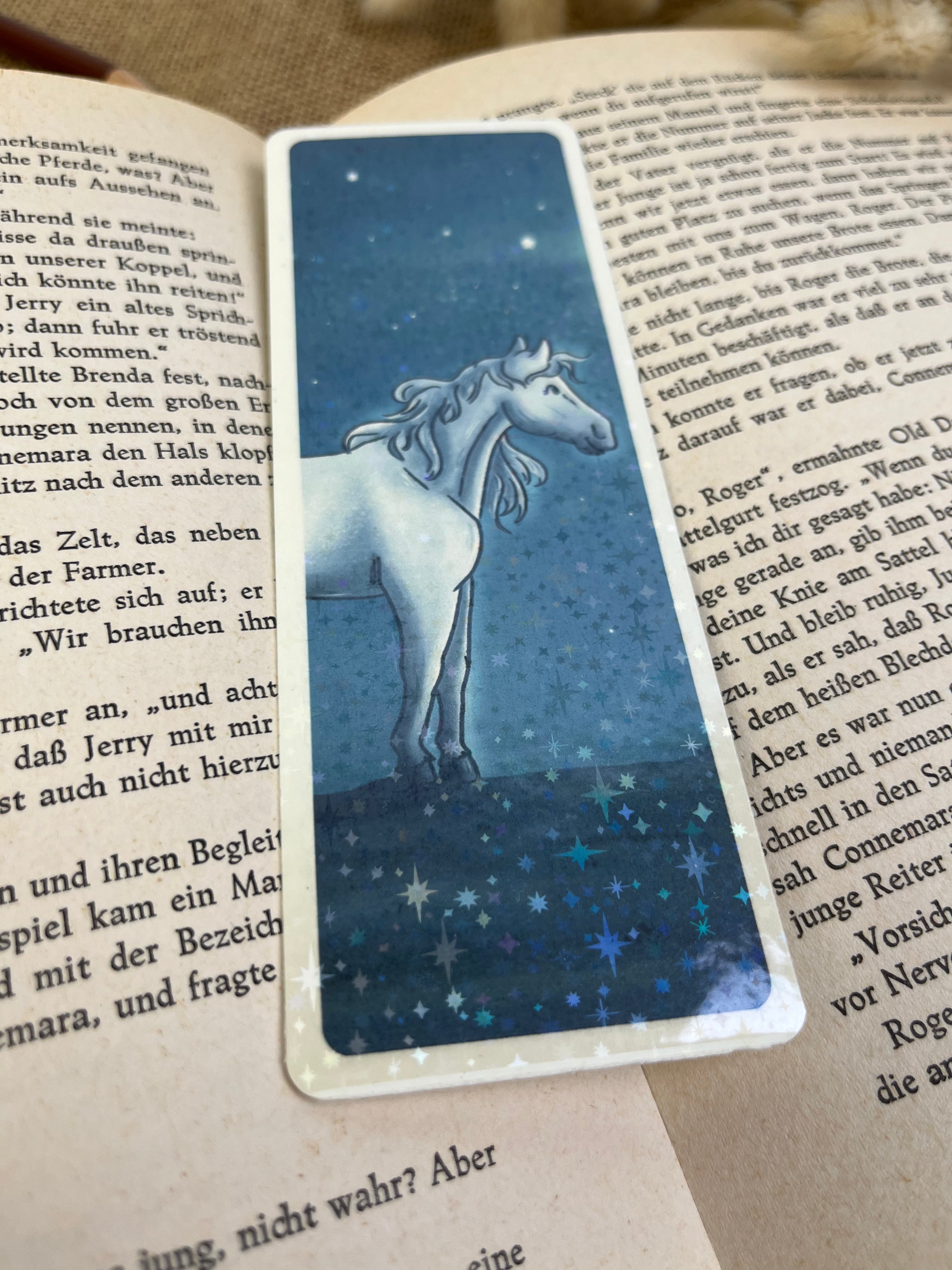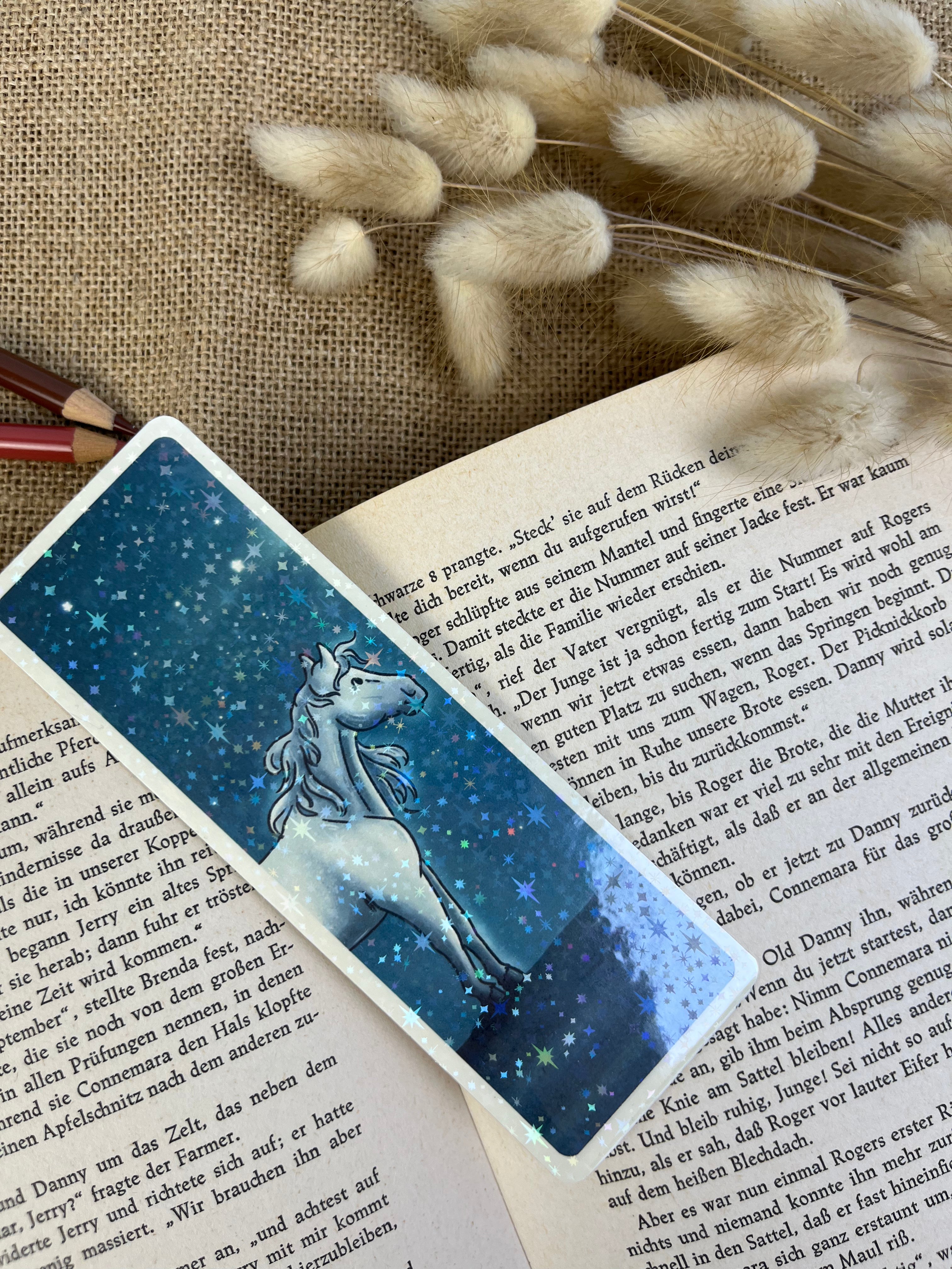 Ein Motiv voller Fantasie und leiser Magie. Das Sternenpferd steht für Freiheit, Träume und die besondere Verbindung zwischen Mensch und Tier. Ideal für alle, die Pferde lieben und sich beim Lesen gerne in andere Welten tragen lassen.