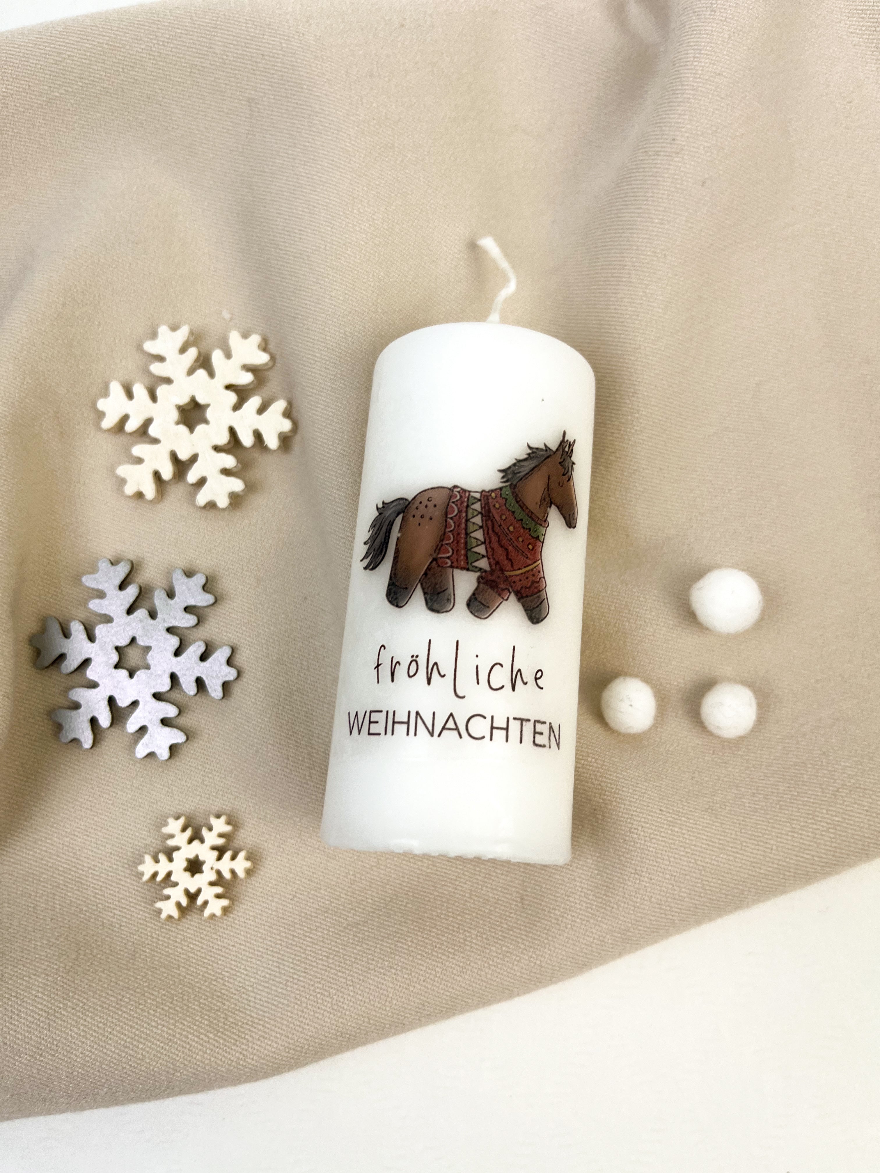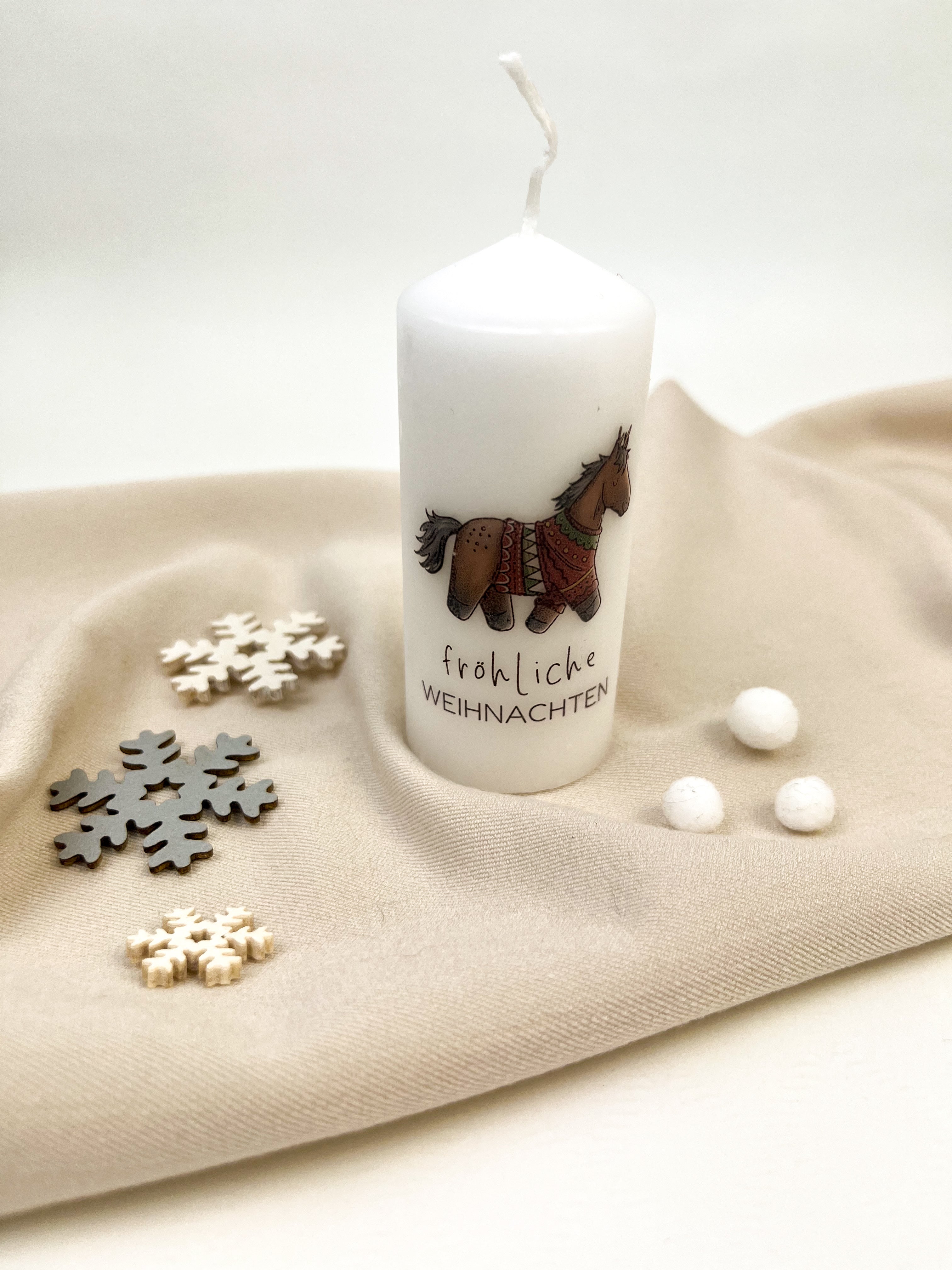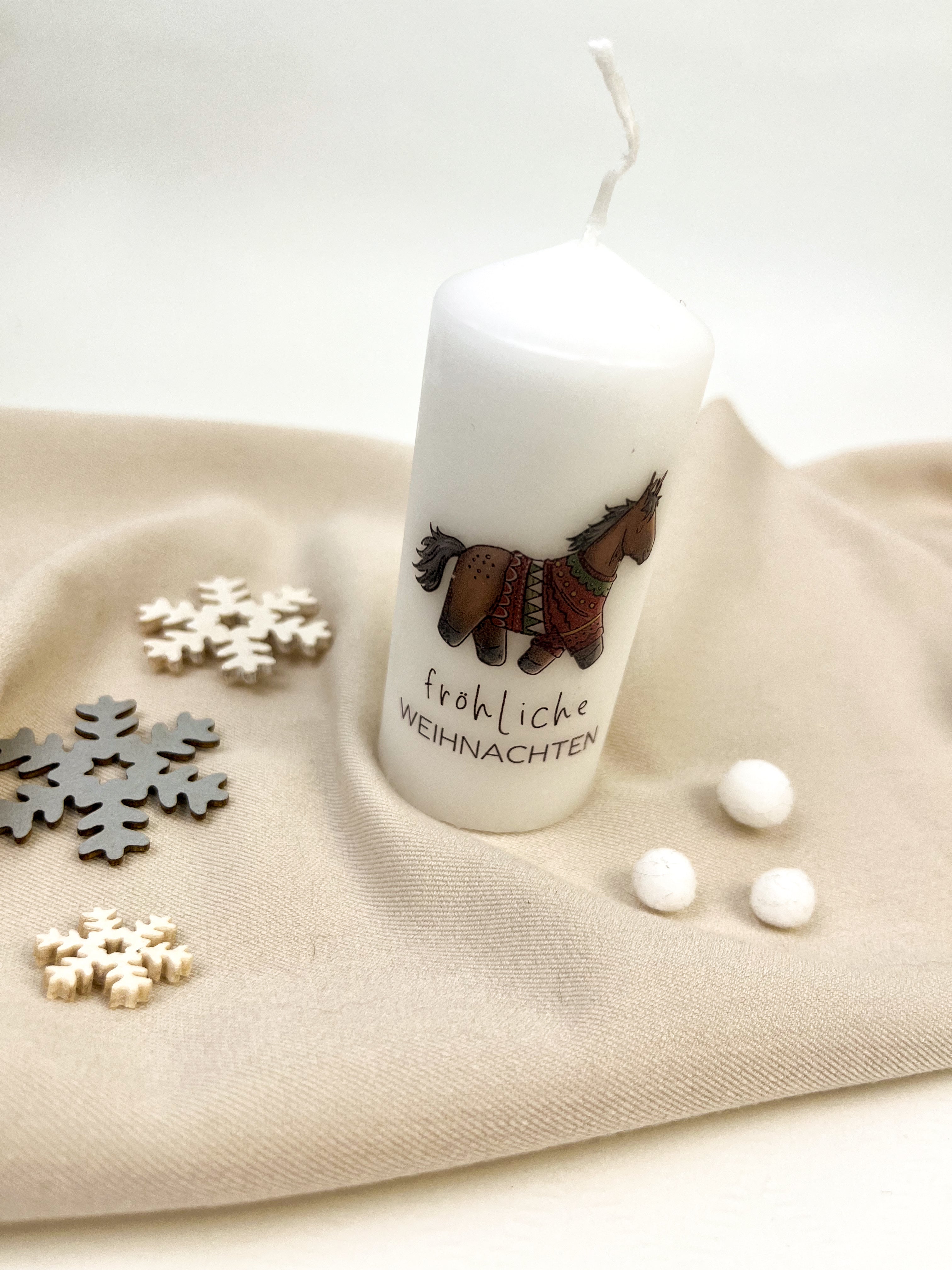 Diese Stumpenkerze verleiht jedem Raum weihnachtlichen Glanz. Die süßen Pferdemotive machen sie zu einem besonderen Highlight für Pferdefans und zu einem schönen Geschenk in der Adventszeit.